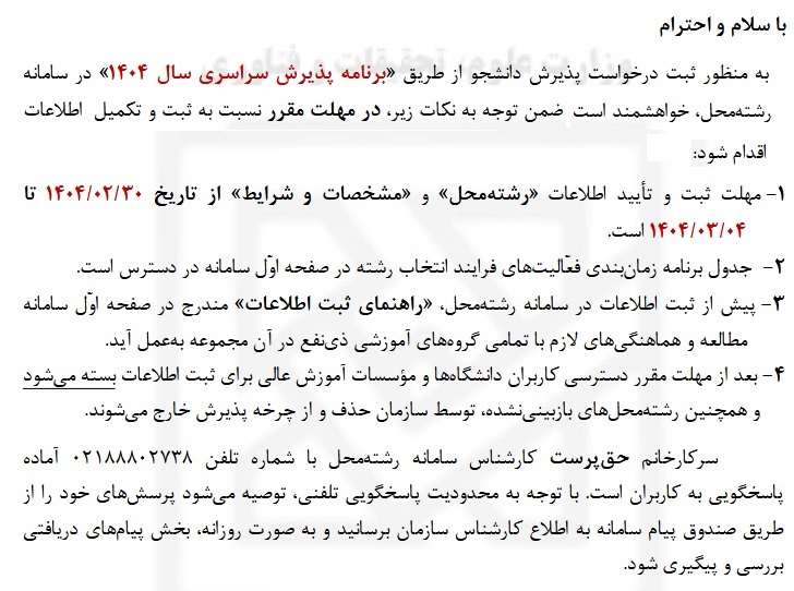 اطلاعیه سازمان سنجش آموزش کشور در خصوص درخواست پذیرش دانشجو از طریق «برنامه پذیرش سراسری سال ۱۴۰۴» به شرح ذیل می باشد:
